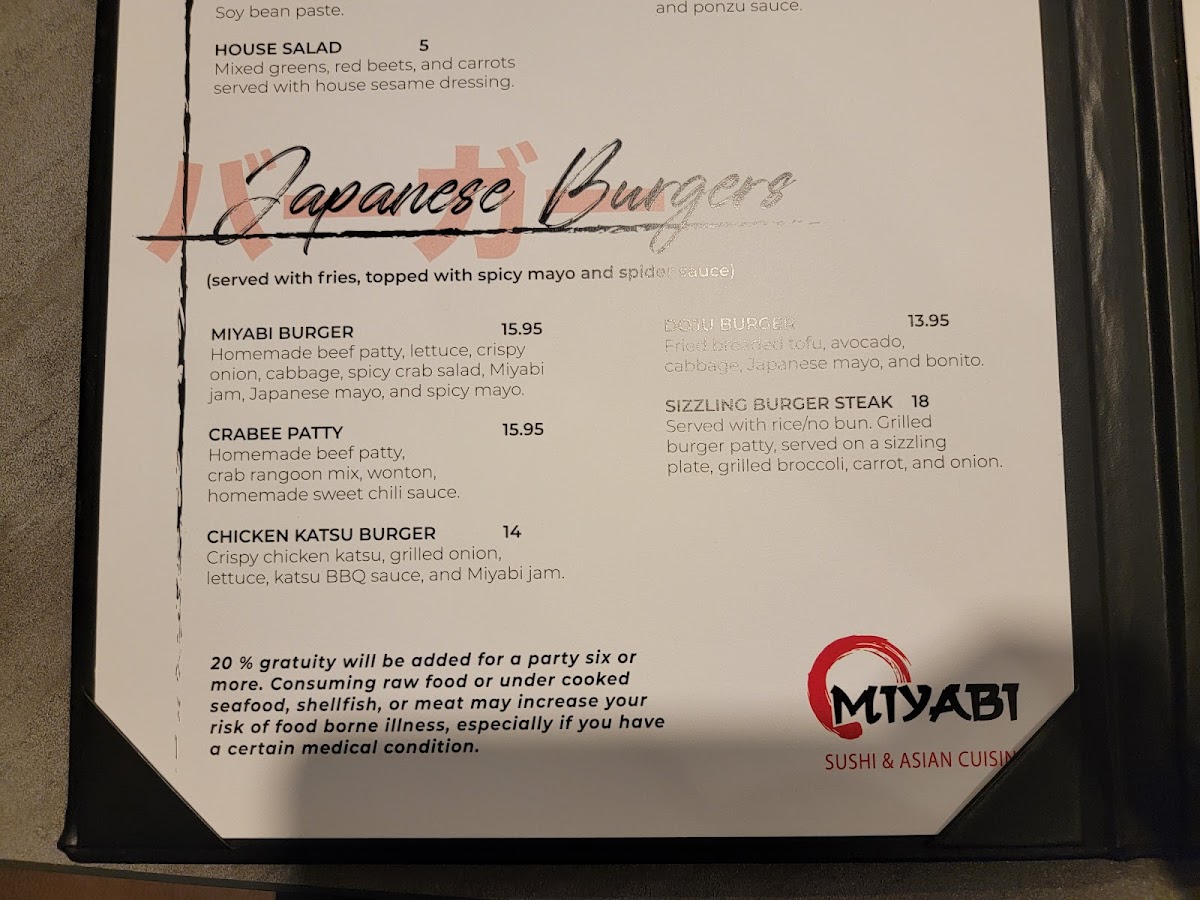 Nestled in Fort Wayne, IN, Miyabi Sushi & Asian Cuisine harmoniously blends traditional Japanese flavors with a modern twist. The all-day menu showcases chef signature dishes that highlight the culinary art and fresh ingredients. One standout is the Miyabi Burger, boasting a homemade beef patty complemented by spicy crab salad and authentic Japanese mayo, creating a delightful fusion for just $15.00.